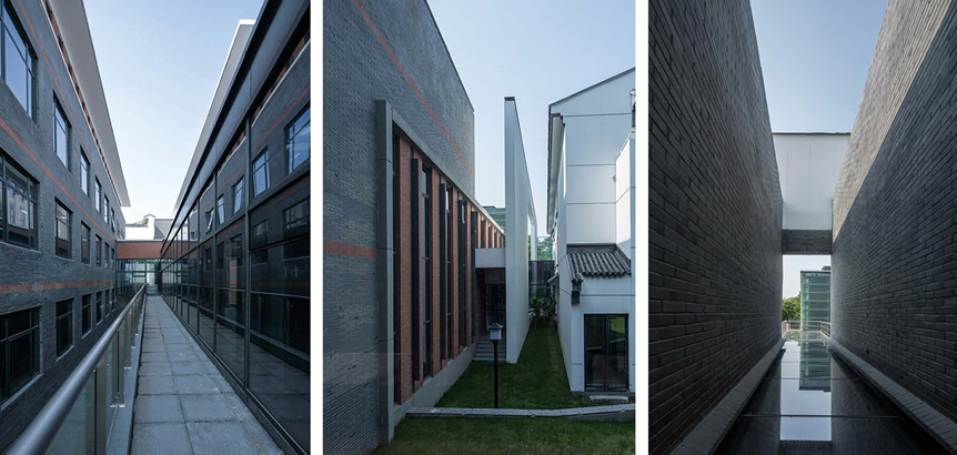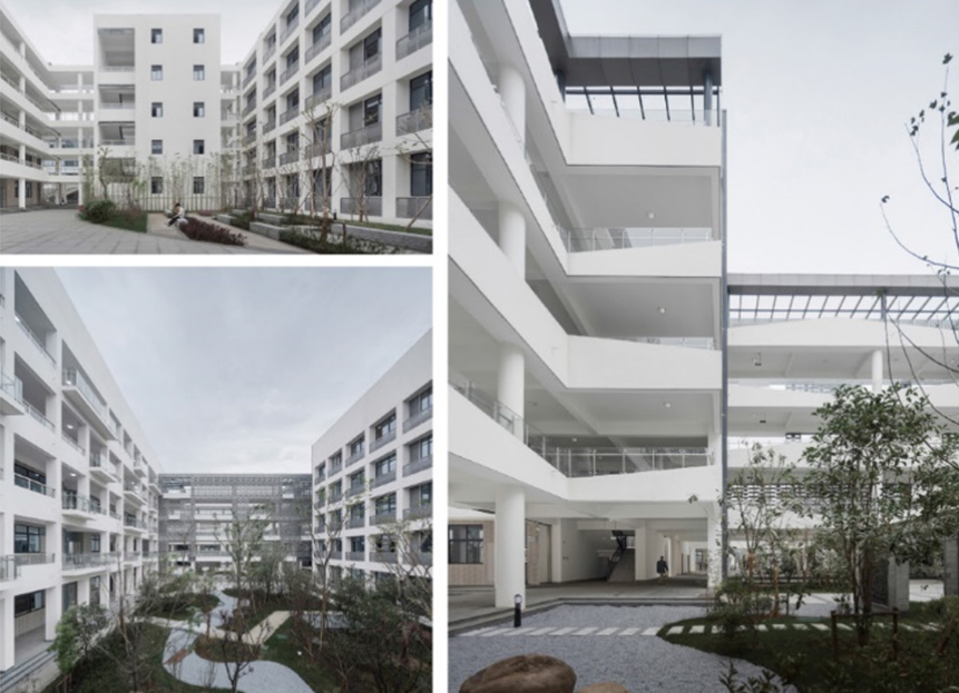 設計以江南書(shū)院空間為原型,突破傳統行列式布局,構建多層次圍合式庭院體系。核心區以連廊串聯(lián)教學(xué)樓、實(shí)驗樓等五大功能體塊,圍合出中心景觀(guān)主院——這一兼具交通樞紐與社交空間的雙重載體,通過(guò)立體動(dòng)線(xiàn)激發(fā)師生與場(chǎng)景的即時(shí)互動(dòng)。各單體建筑均設有獨立內庭院,形成“院中有院”的空間層級,以框景手法將自然景觀(guān)引入室內,營(yíng)造虛實(shí)交融的教學(xué)情境。